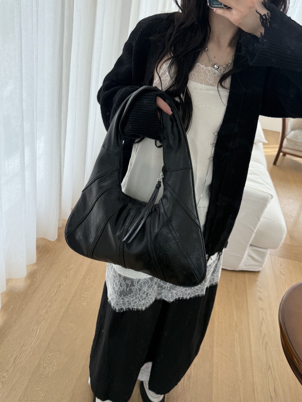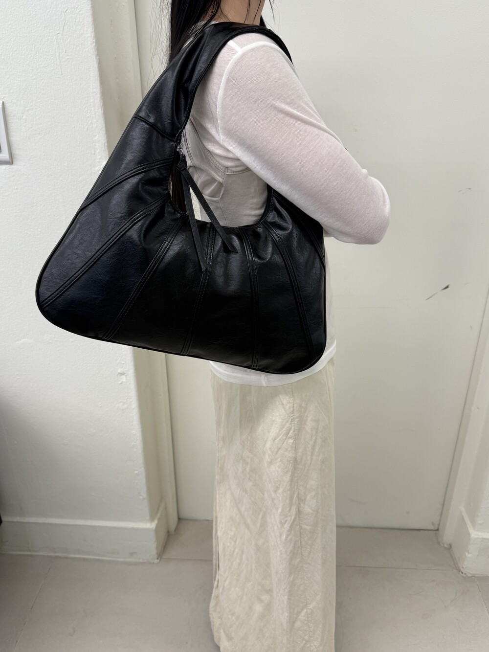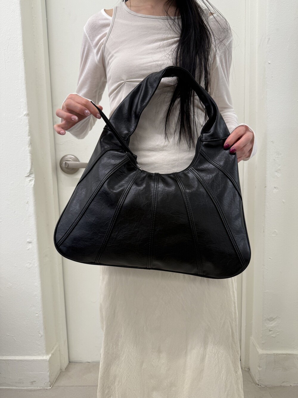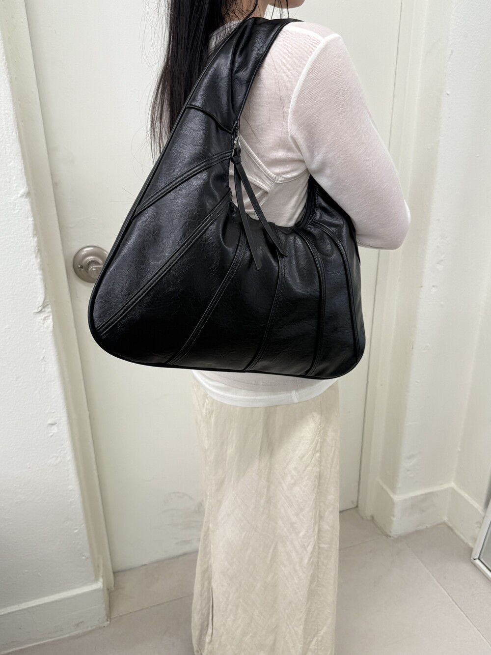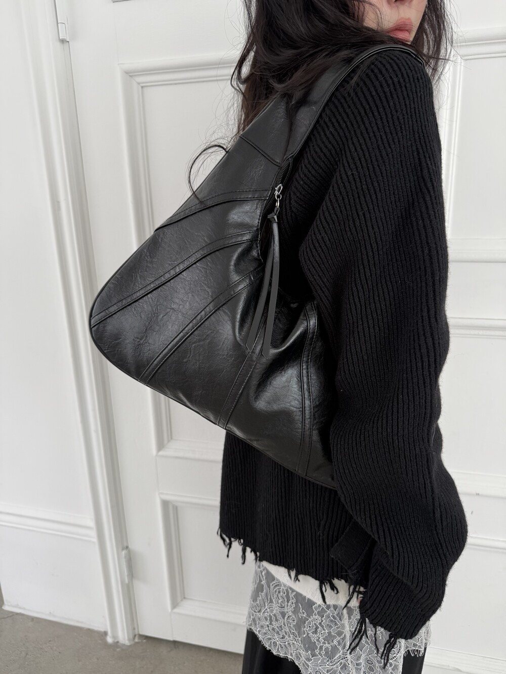 Point 1. 부드러운 터치감을 자랑하는 가죽 소재를 사용해 유연한 착용감을 주지만, 가방 전체의 쉐입은 탄탄하게 잡아주어 흐트러짐 없는 실루엣을 완성합니다.